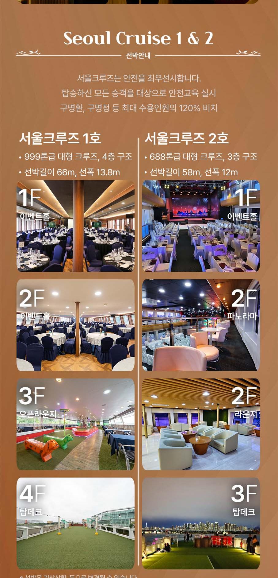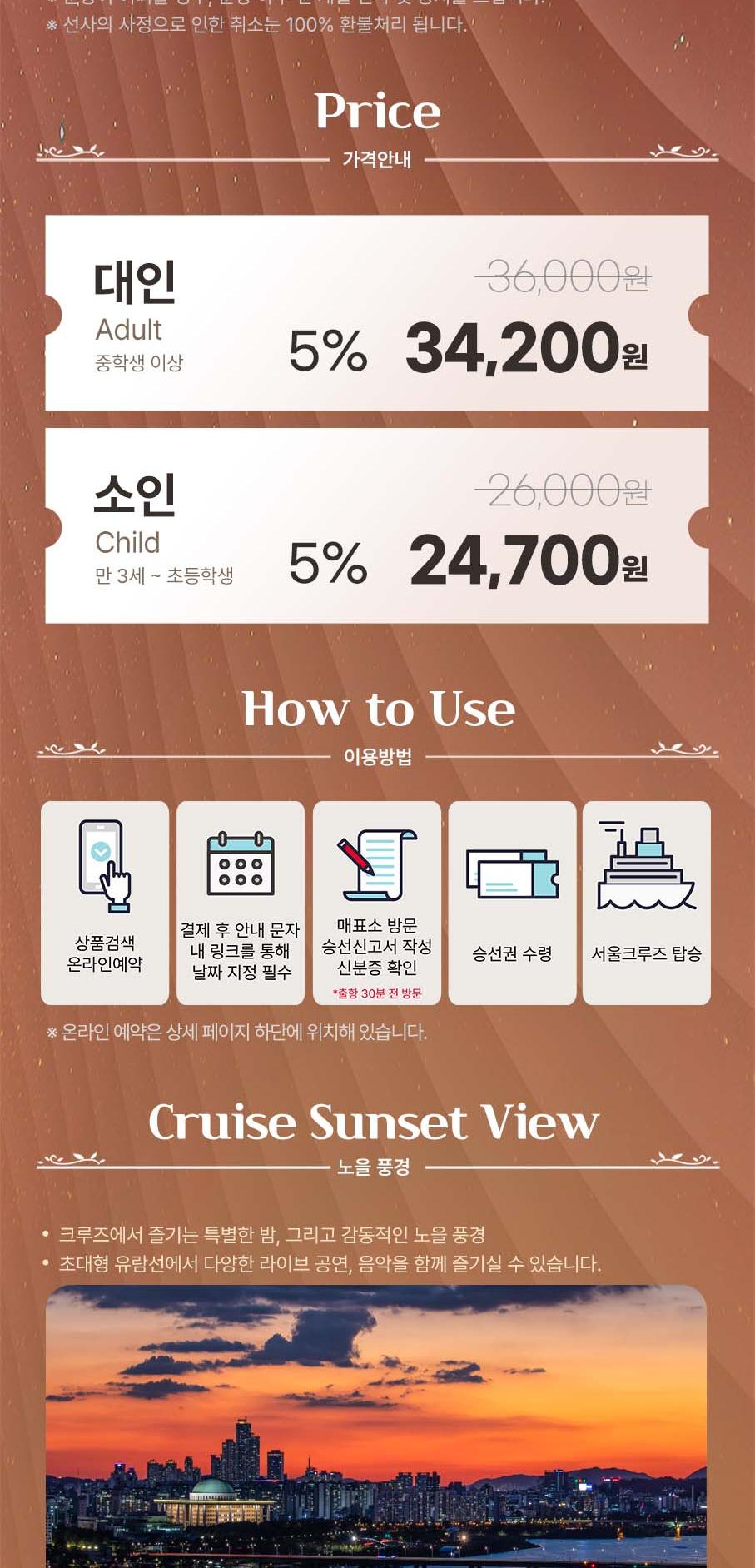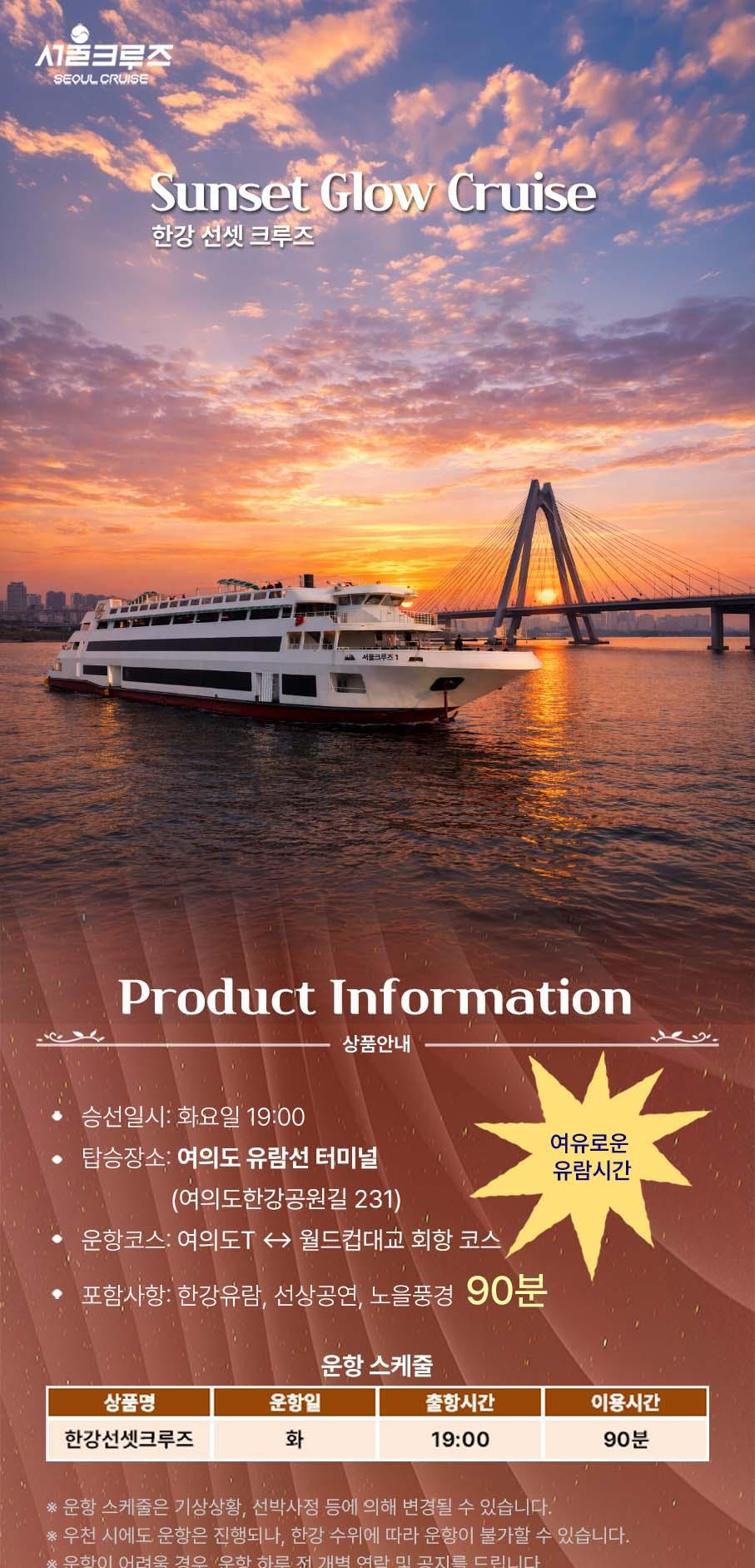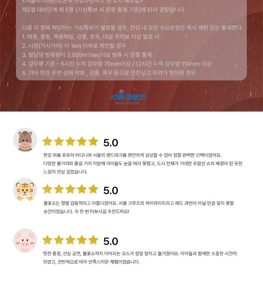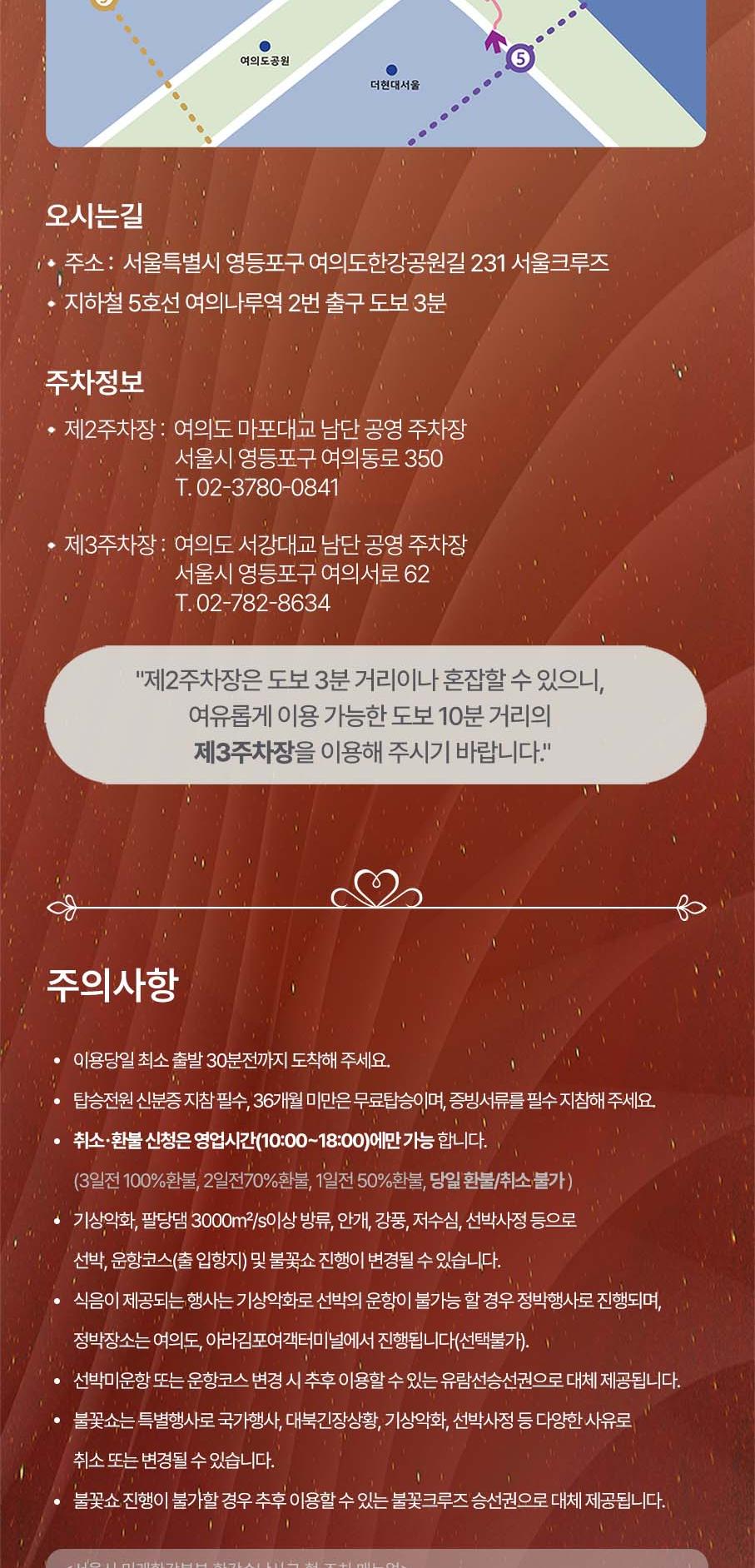 * 한강방류, 기상악화, 선박사정 등으로 한강 운항이 불가능할 경우 김포 아라뱃길 코스로 진행되며, 이로 인한 환불 및 요금 인하는 없습니다.