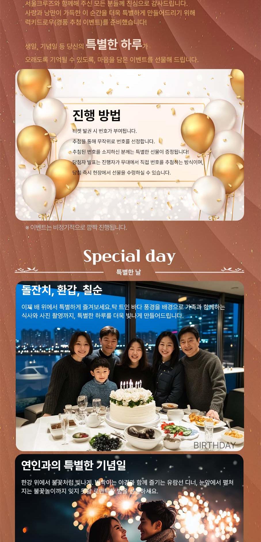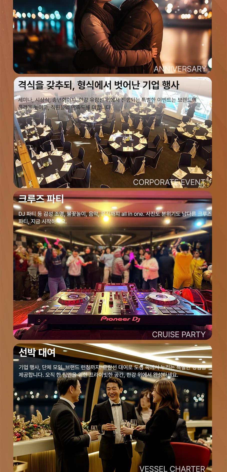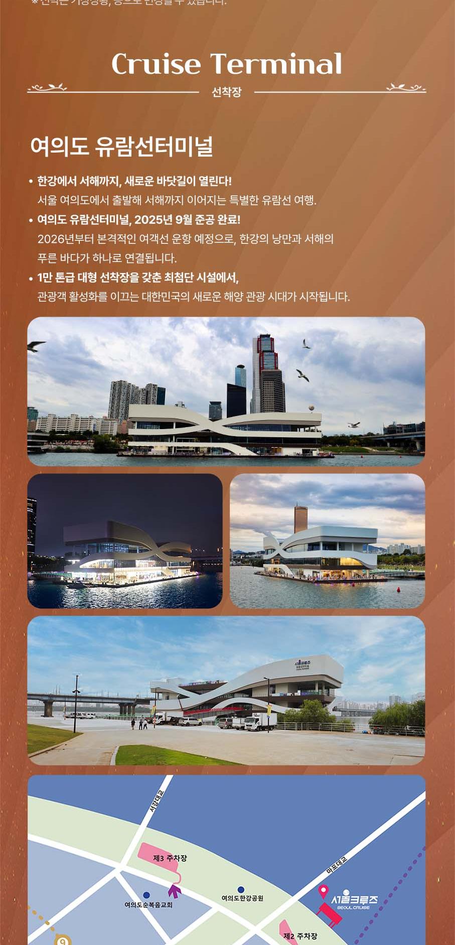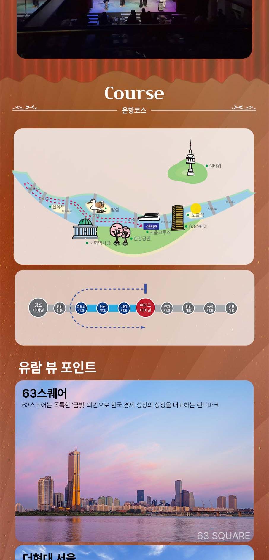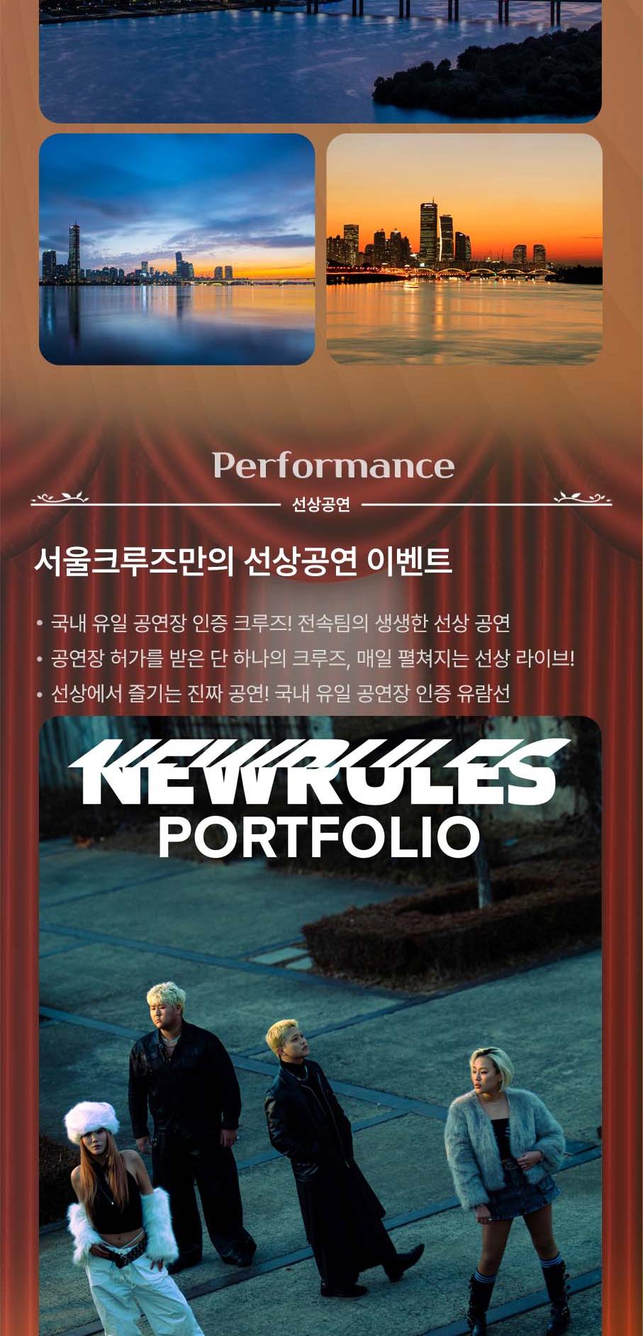 * 한강방류, 기상악화, 선박사정 등으로 한강 운항이 불가능할 경우 김포 아라뱃길 코스로 진행되며, 이로 인한 환불 및 요금 인하는 없습니다.