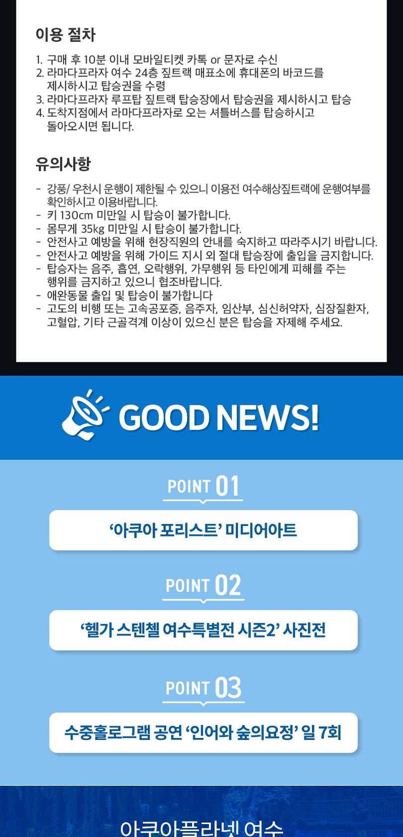 - 강품/우천시 운행이 제한될 수 있으니 이용전 여수해상짚트랙에 운행여부를 확인하시고 이용바랍니다.